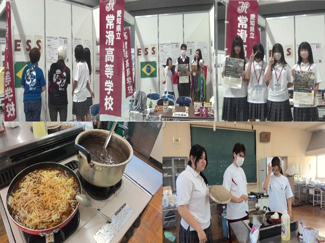 SDGs1つめ活動として「防災食の海外料理リメイクの学習と調理」を紹介しました。常滑市役所と本校から提供された賞味期限間近の防災保存食を、海外料理風にリメイクをしたときの様子をポスターにし、活動を紹介しました。当日は訪問客だけでなく、出展している企業の方々、大学生、高校生や個人参加者と交流ができ、生徒は大いに刺激を受けたようです。また清掃も丁寧にすることができました(ゴミを残すと罰金が科せられます)。