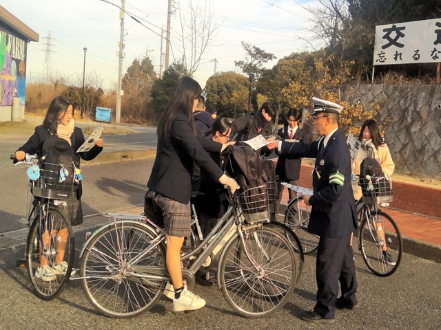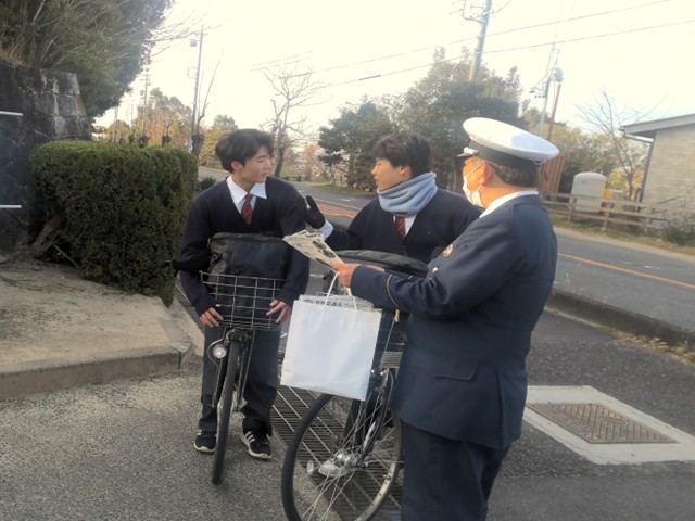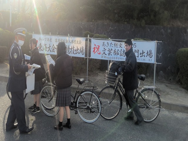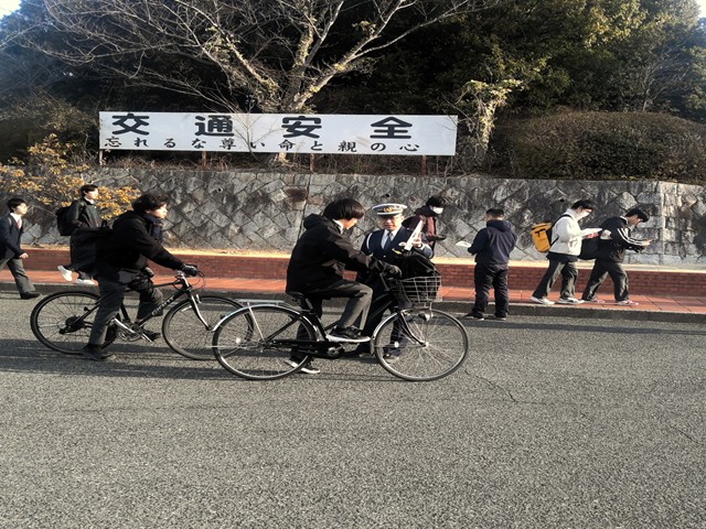 その際、自転車通学者へ向けて、来年度の4月から改正される道路交通法についての周知を促しました。4月からは自転車の交通違反に青切符が導入されるようになり、「ながらスマホ」や「信号無視」といった反則行為について、反則金が課されるようになります。通学時以外でも、自転車を利用する際には自転車安全利用五則を守り、交通事故から命を守るよう心がけましょう。
