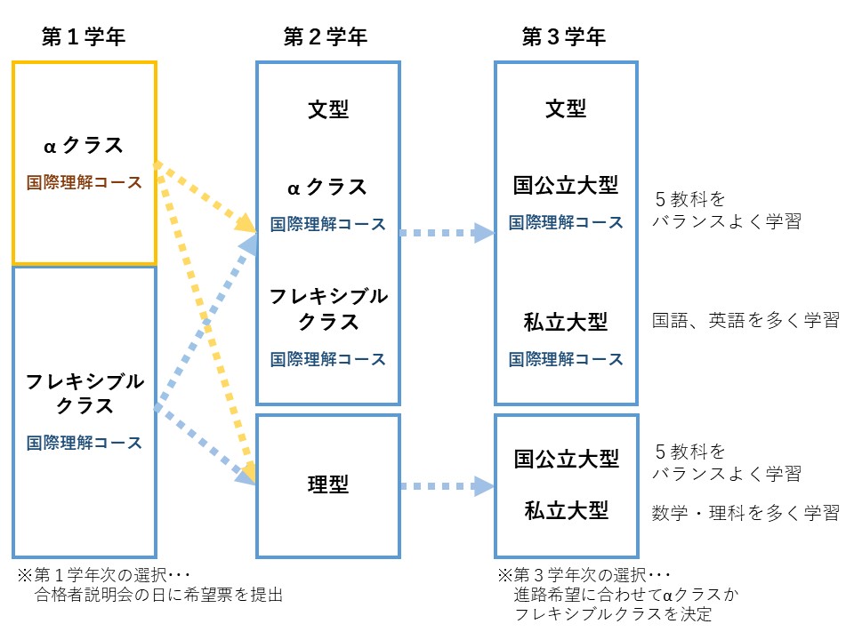 2年次からは、進路希望に応じて文型と理型に分かれます。国際理解コースの生徒には再度希望を採り、国際理解コースを選択した場合は文型クラスに所属します。